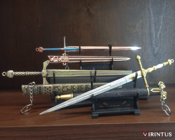Miniaturowy miecz z Elden Ring z precyzyjnym wykończeniem – doskonała ozdoba do biurka lub półki.