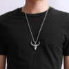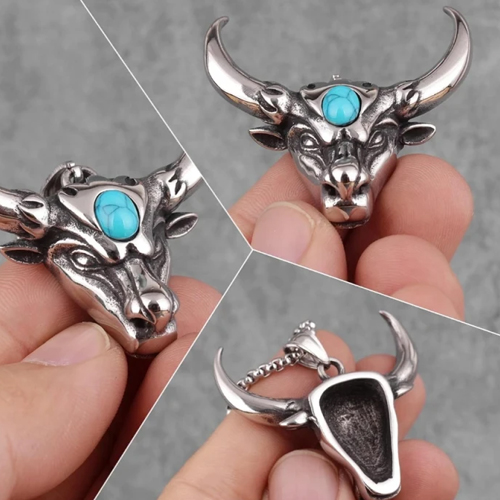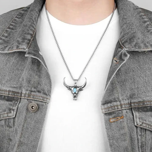 Masywny naszyjnik z głową byka to połączenie siły, symboliki i stylu. Wykonany ze stali nierdzewnej z turkusowym akcentem, przyciąga wzrok i dodaje charakteru każdej stylizacji. Zawieszka o wymiarach 3,8 × 4 cm zawieszona jest na łańcuszku o długości 60 cm, co zapewnia wygodę noszenia. Materiał jest odporny na korozję i bezpieczny dla skóry wrażliwej. Symbol byka to wyraz mocy, odwagi i determinacji. Świetnie sprawdzi się także jako wyjątkowy prezent.